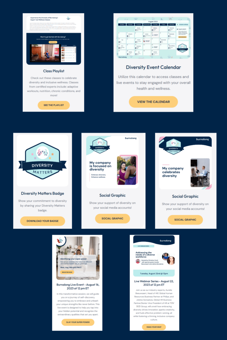 Burnalong’s Diversity Resource Hub is a comprehensive toolkit dedicated to prioritizing and celebrating diversity in every aspect, providing valuable insights and tools to support the health and wellness of a diverse and thriving workforce. With a focus on inclusivity, this hub fosters and empowering community that embraces individuals of all ages, health and fitness levels, and abilities.