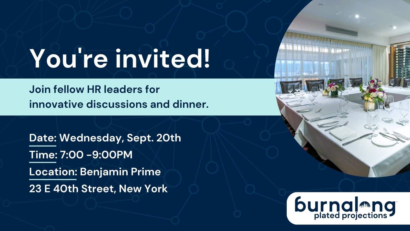 Find new ways of collaborating with likeminded leaders in your area while enjoying a delicious dinner. Past attendees include top HR professionals from the US Navy, Vox, WeWork, and more, and we'd love to add your name to our list of VIPs.