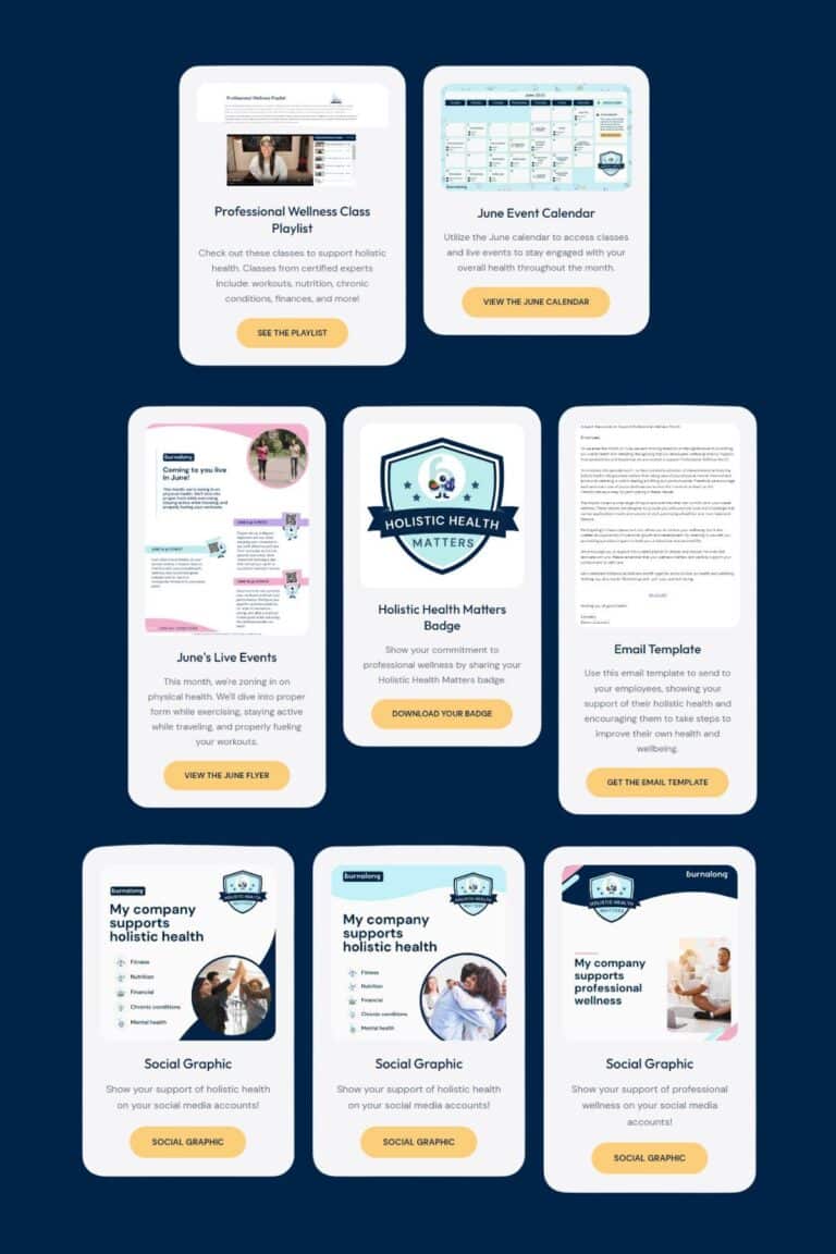 This comprehensive toolkit is meticulously crafted to facilitate your efforts in prioritizing the holistic wellbeing of your employees, while minimizing the burden on your organization. It encompasses a wide array of resources, such as interactive classes, live events, and educational materials, all tailored to be shared with your workforce. Emphasizing end-to-end support, this toolkit provides a wealth of resources to foster the wellness of your employees at every stage.